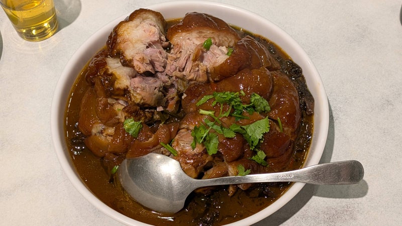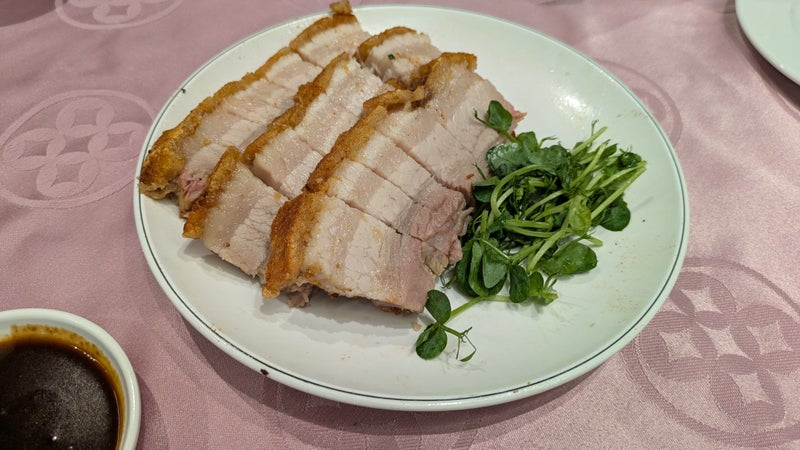 これが客家料理で一番有名な梅干菜扣肉(メイガンツァイ コウロウ)という豚バラ肉をカラシナ漬けと蒸し煮にした料理です。