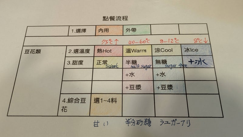このメニューのように、冷たいものか暖かいものか、甘さ、トッピングなど各自の好みで組み合わせてオーダーします。