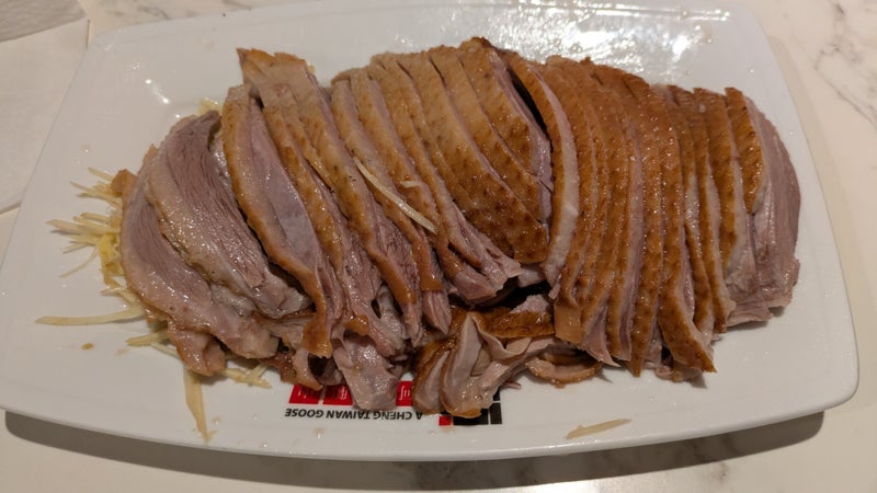 肉の部位は「前半段」という胸肉と「後半段」という腿肉があり、普通のローストと燻製が選べるのですが、月曜日の今日は市場が休みのため鵞鳥の入荷が少なく、胸肉の燻製しかありませんでした。