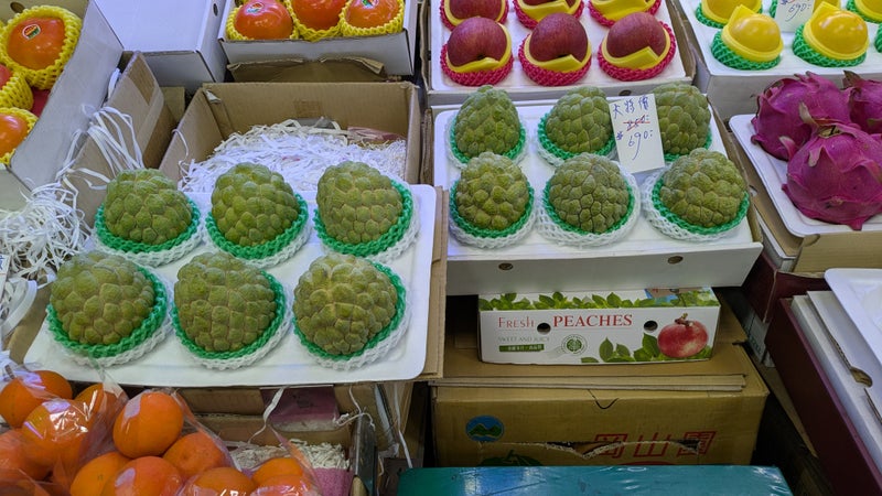 これは釋迦頭「シャカトウ」と呼ばれる台湾名産のフルーツで、お釈迦様の頭を思わせるデコボコが表面を覆っている果物です。