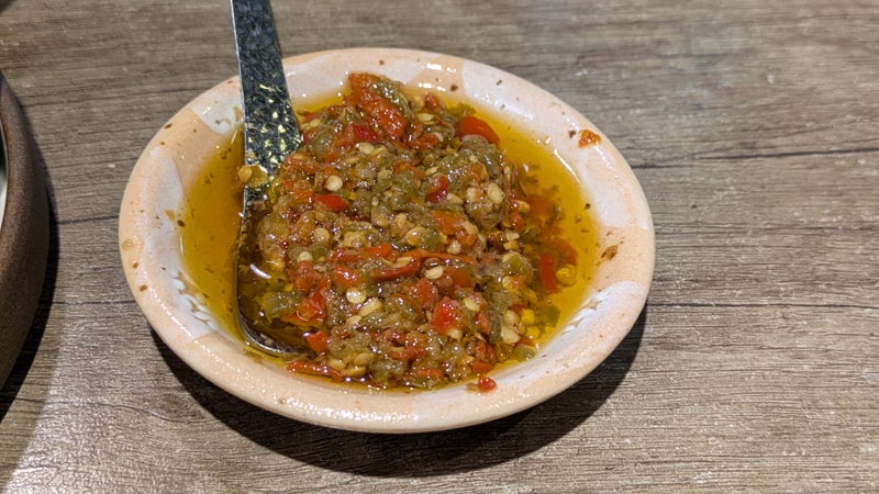 レッドペッパーとグリーンペッパーを種まで使って作っていて、適度な辛さといい味といい最高でした。