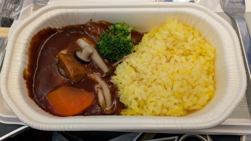 機内食で軽く一杯やって今日からの過食の日々に備えます。