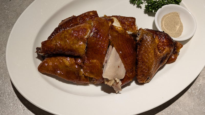 肉の部位は「前半段」という胸肉と「後半段」という腿肉があり、普通のローストと燻製が選べるのですが、月曜日の今日は市場が休みのため鵞鳥の入荷が少なく、胸肉の燻製しかありませんでした。
